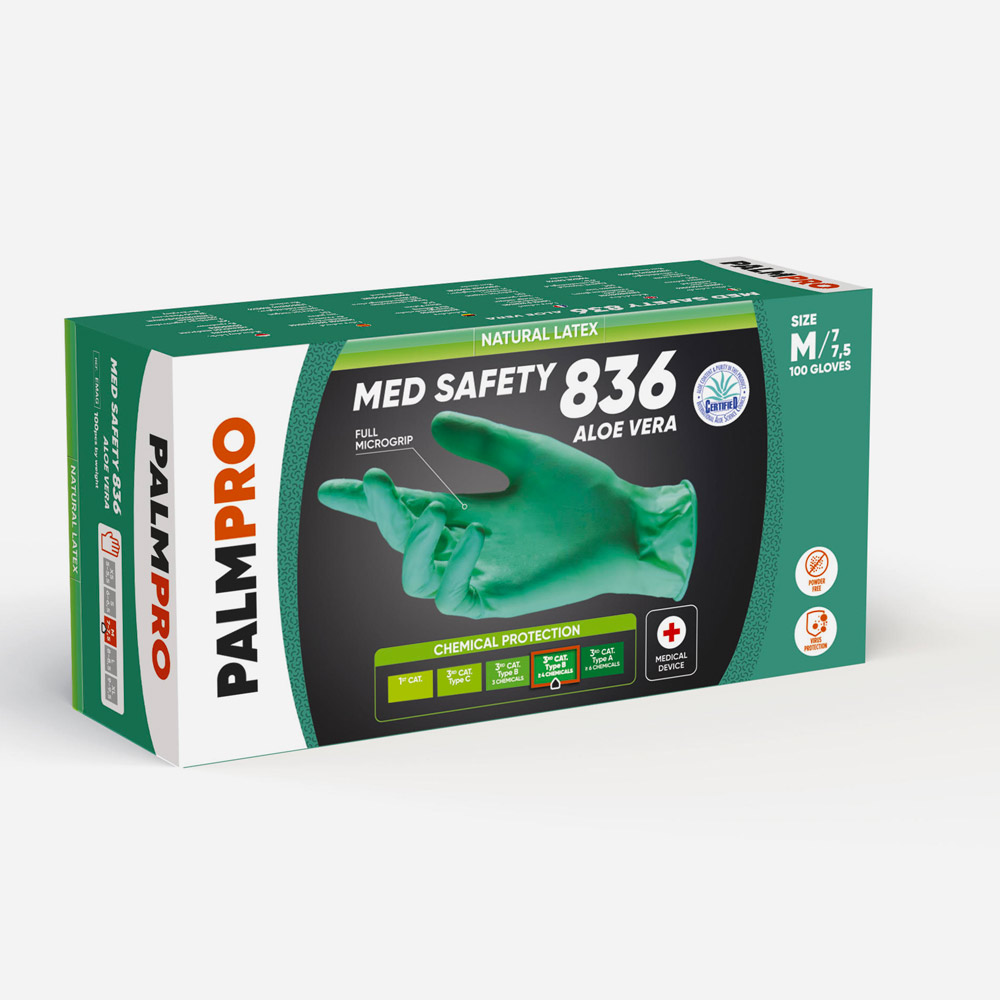 Guanto medicale in LATTICE DI GOMMA NATURALE senza polvere lubrificante, ad elevata bio-compatibilità, microruvido, con elevate caratteristiche prestazionali, di qualità controllata e certificata. Sottoposto a doppio processo di alogenazione e successivo trattamento interno con gel di Aloe Vera “Active Aloe™”, che idratando la pelle, riduce gli effetti dell’uso frequente dei guanti. Guanto non sterile, in lattice di gomma naturale con contenuto proteico <50μg/g, ambidestro con bordino, a finitura interna opaca ed esterna microruvida.